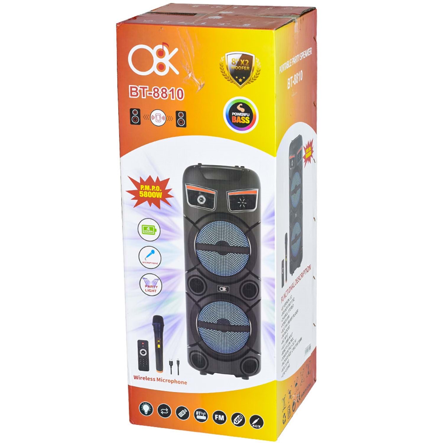 O8K Bluetooth ve USB Girişli 2X8 İnch Şarjlı Işıklı 1 El Mikrofonlu Müzik Sistemi BT-8810